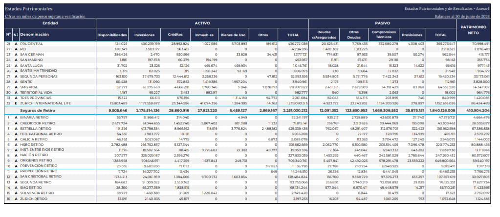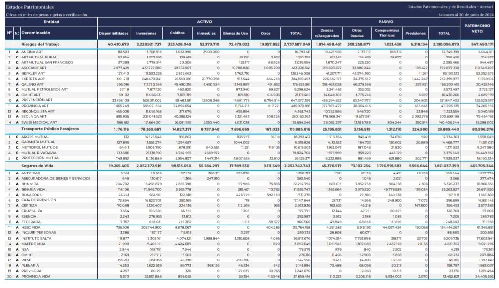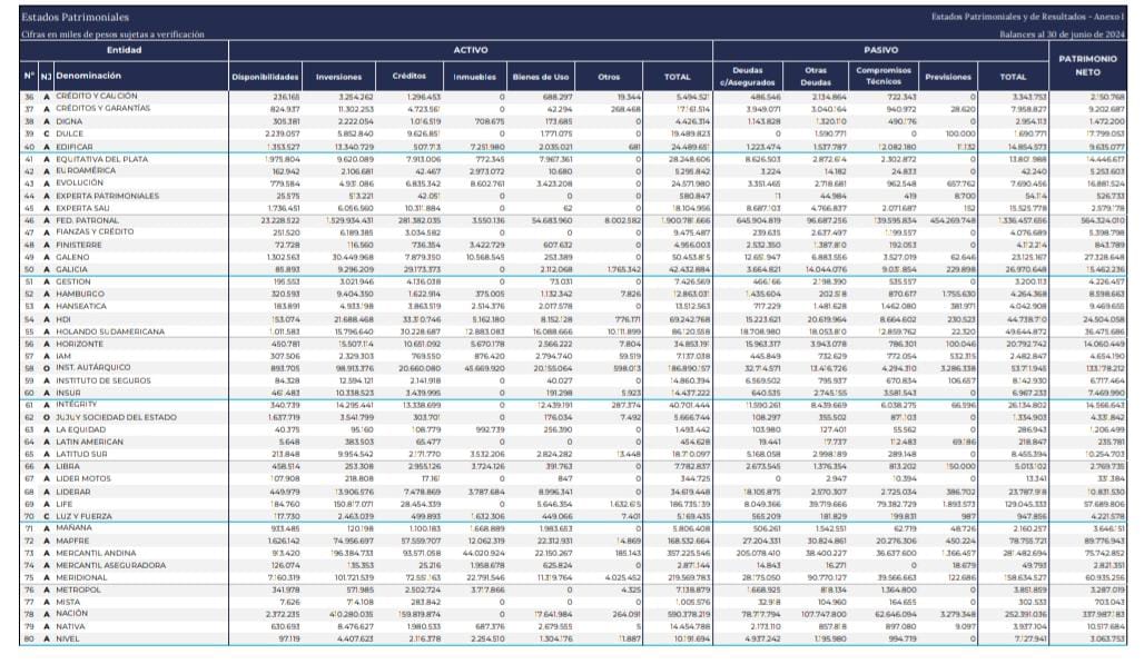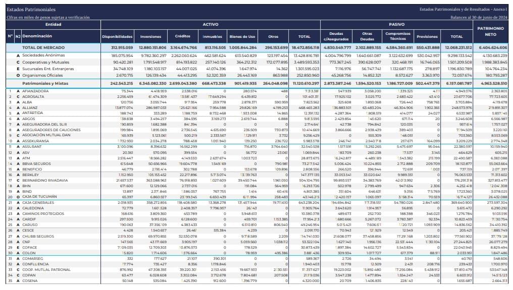 El Anexo I conformado por los cuadros de datos de los Estados Patrimoniales y de Resultados por entidad aseguradora clasificada según su actividad principal también se encuentra disponible en planilla de cálculo en https://www.argentina.gob.ar/superintendencia-de-seguros dentro de la sección Estadísticas > Información Contable > Estados Patrimoniales y de Resultados, con un nivel mayor de desagregación.
