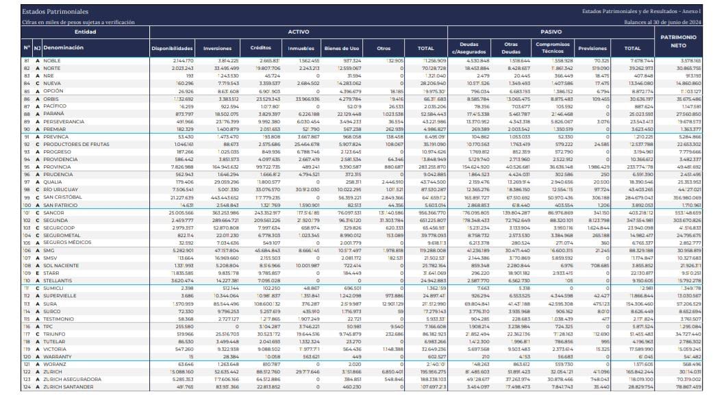Se exponen datos agregados para todo el mercado y por cada una de las actividades principales de las Entidades Aseguradoras a partir de los Balances Anuales presentados por 191 entidades autorizadas a operar al 30 de junio de 2024: 124 de Seguros