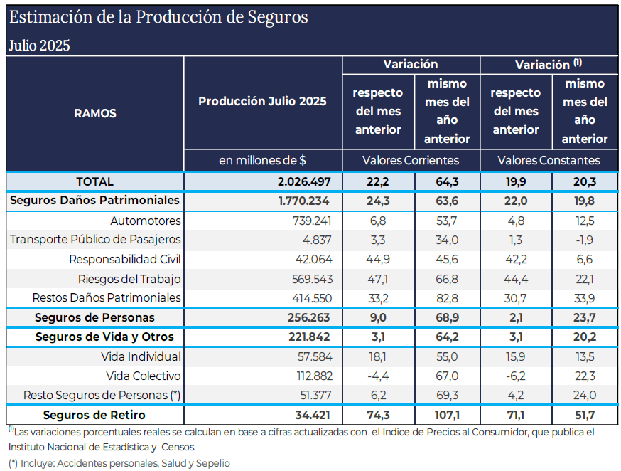 A través de la misma hace saber que la estimación de la Producción Total de Seguros para el mes de Julio 2025 fue de 2,026 Billones de pesos, de los cuales el 87,4% corresponde a los Seguros Patrimoniales, el 10,9% a los Seguros de Vida y Otros (Vida Individual/Colectivo y resto Seguros de Personas), y el 1,7% a los Seguros de Retiro.