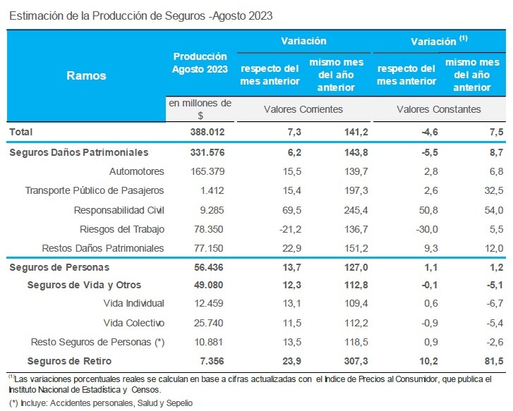 La Producción Total de Seguros para dicho mes fue de 2023 fue de 388.012 millones de pesos, de los cuales el 85,5 % corresponde a los Seguros Patrimoniales, el 12,6 % a los Seguros de Vida y el 1,9 % a los Seguros de Retiro. Dicha cifra indica a valores corrientes, un incremento del 141,2 % con respecto al mes de agosto de 2022 y a valores corrientes superior en 7,3 % en relación a julio 2023.
