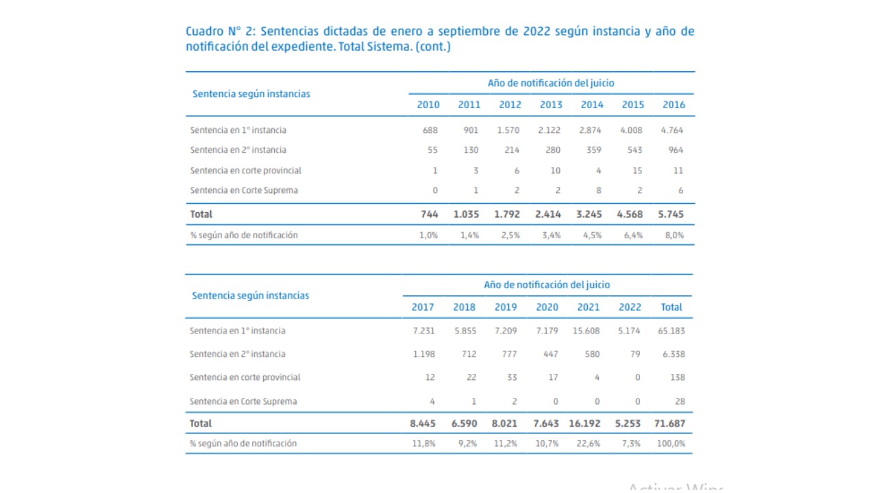 Por su parte, en este mismo periodo se dictaron un total de 71.687 sentencias y el stock al 30 de septiembre de 2022 es de 280.212 expedientes judiciales (Cuadro N° 2 y Gráfico N° 1).