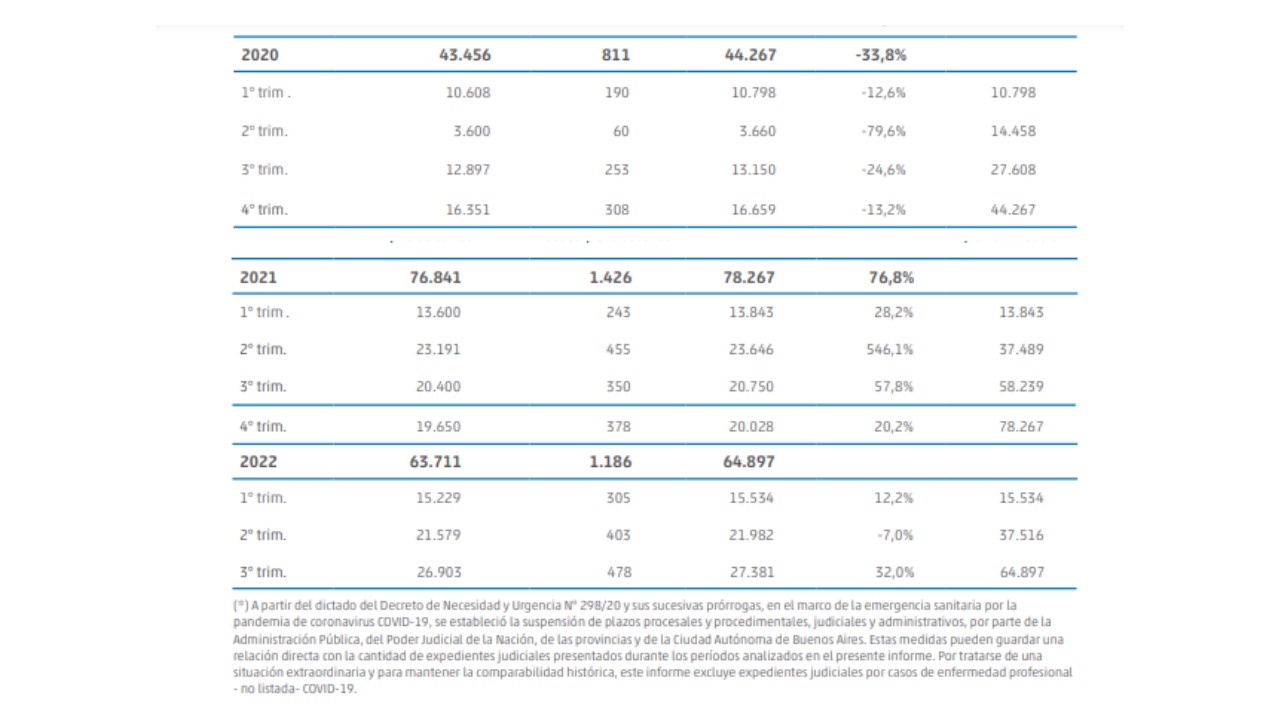 En el tercer trimestre del 2022 se registraron 27.381 nuevos expedientes judiciales: 26.903 fueron juicios iniciados por trabajadoras y trabajadores de unidades productivas y 478 fueron litigios de