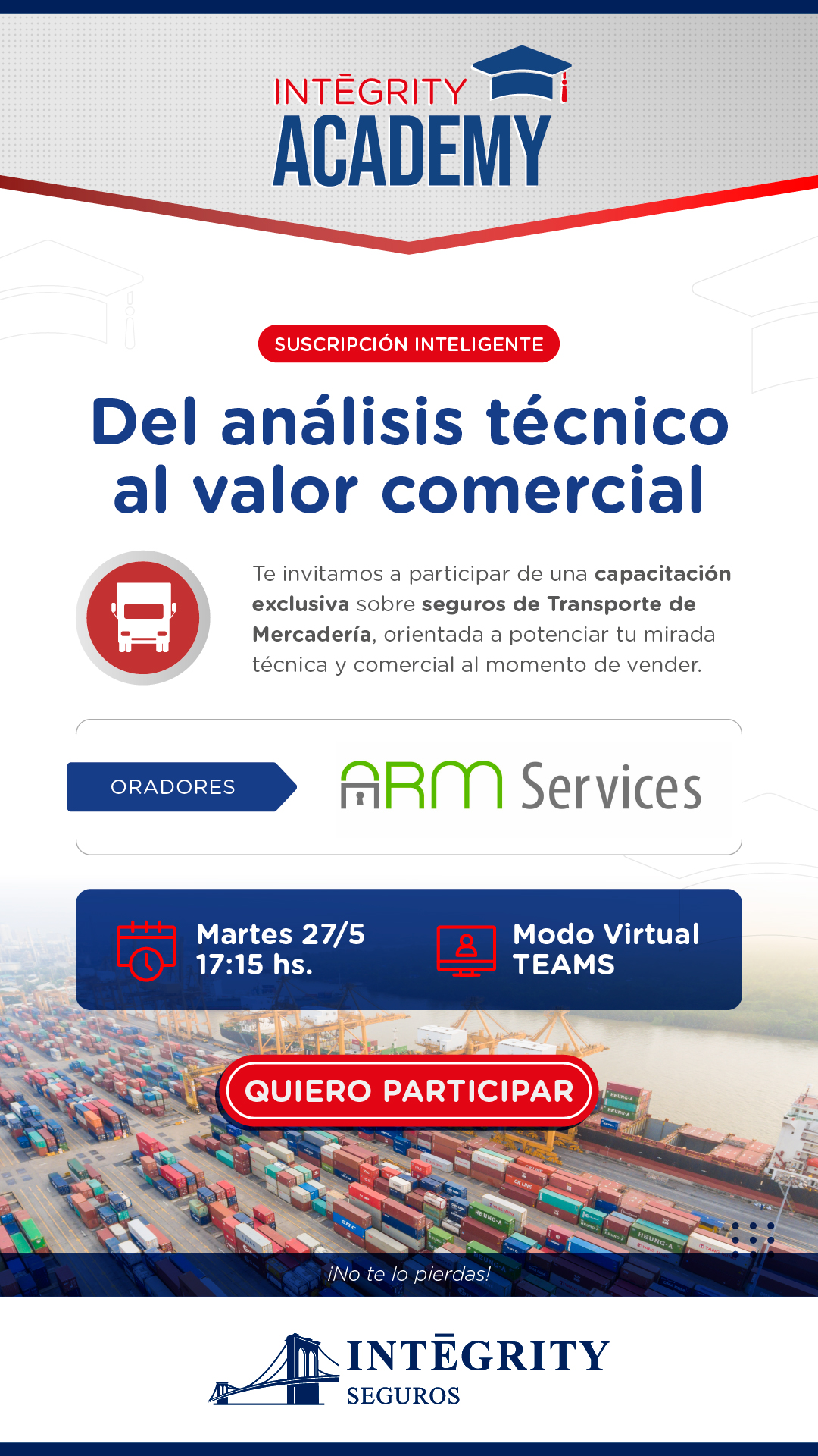 El próximo martes 27 de mayo a las 17hs. daremos inicio a una nueva capacitación de Integrity Academy, enfocada en Suscripción de Transporte: del análisis técnico al valor comercial. La jornada estará a cargo de los especialistas de ARM Services y está dirigida especialmente a nuestros productores asesores, con el objetivo de brindar herramientas clave para impulsar este ramo y generar un espacio de intercambio con quienes apuestan al negocio.