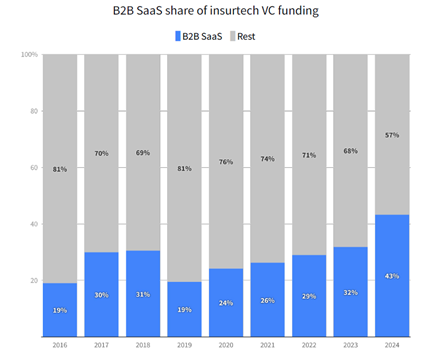 Las compañías del ecosistema insurtech enfocadas en el Software as a Service (SaaS) y con un modelo de negocio B2B (Business to Business) han conseguido el 43% de la financiación total, la tasa más alta de la historia.