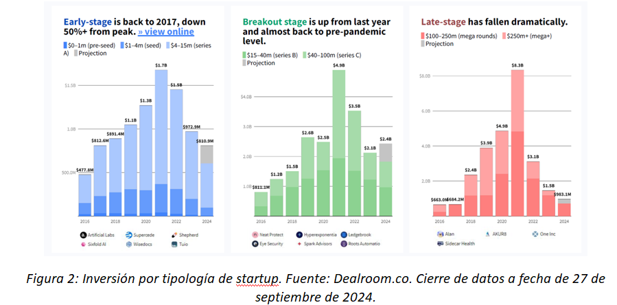En lo que respecta a aquellas en Series B o C, su financiación ha sido la más alta de todas y las perspectivas indican que a cierre de 2024 llegará a los 2,4 mil millones de dólares. Estos datos colocan su situación actual en niveles pre-pandemia, lo que apoya la estabilización que está viviendo el mercado.