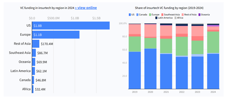 Analizando el mercado insurtech por geografías, Estados Unidos continúa liderando la inversión, seguido de Europa (1,8 y 1,1 mil millones de dólares, respectivamente). Ambas regiones están mostrando un rendimiento bastante positivo y la tendencia indica que continuarán así.
