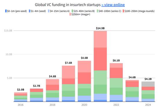 La financiación de capital de riesgo en startups de tecnología aplicada a los seguros (insurtech) está en proceso de estabilización gracias al impulso de las startups en series B y C de financiación. En concreto, se espera que alcance los 4,2 mil millones de dólares a final de 2024, cifras similares a las de 2018 y 2023.