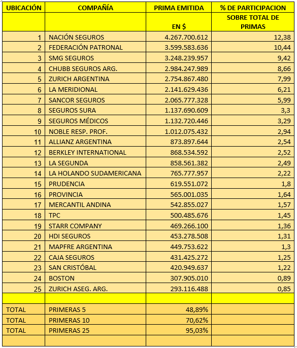 NACIÓN SEGUROS es la aseguradora que lidera el ranking, con una producción de $ 4.267.700.612 y una participación en el segmento del 12,38 %. Ocupan del 2º al 5º puesto: FEDERACIÓN PATRONAL ($ 3.599.583.636 Y 10,44 %), SMG SEGUROS ($ 3.248.239.957 y 9,42 %), CHUBB SEGUROS ($ 2.984.247.989 y $ 8,66 %) y ZURICH ARGENTINA ($ 2.754.867.480 y 7,99 %)