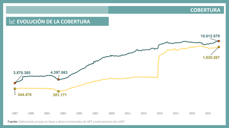 Las ART llegan al 26° aniversario del Sistema, el 1° de julio, con este número auspicioso, no sólo para el sector, sino para el país. Según estimaciones de UART, de acuerdo con los últimos datos disponibles correspondientes a mayo 2022, están bajo cobertura 10.012.879 trabajadores y 1.030.287 empleadores, fruto del crecimiento del empleo privado.
