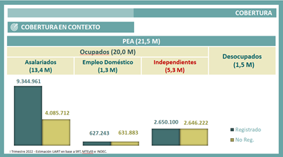 Tomando como fuente datos analizados por UART, desde el mes de agosto del 2020, cuando durante la pandemia la cobertura alcanzó sus menores valores, se observa una recomposición del empleo del sector privado, que fue acompañada en menor medida por el sector público. Según datos del Ministerio de Trabajo, el empleo privado tuvo un aumento del 6,2% lo que representa 350.000 nuevos puestos generados en mayor medida por los sectores de industria, construcción y comercio, mientras que el empleo público creció 3,3%, lo que se traduce en 100.000 nuevos trabajadores para dicho sector. En los últimos meses, se observa una caída del aumento del empleo público frente al empleo privado, que crece lenta pero sostenidamente.