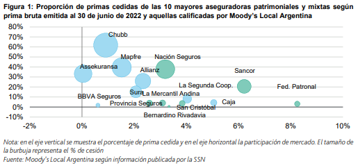 Moody’s Local Argentina considera que este riesgo se encuentra mitigado en parte por las relaciones de largo plazo y sinergias comerciales que las aseguradoras mantienen con los reaseguradores, que les permitiría negociar los plazos de pago ante esta situación. En el caso de compañías de capitales extranjeros, este mitigante es en nuestra opinión mayor dado que una gran parte de sus primas cedidas corresponden a reaseguradores que forman parte del mismo grupo económico.