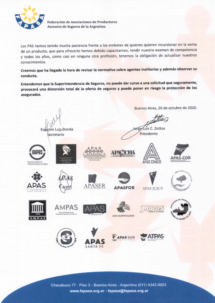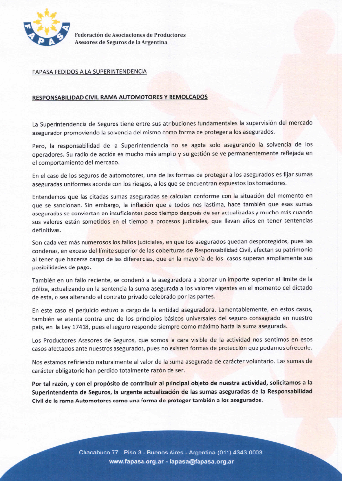 FAPASA solicitó a la SSN la actualización de las sumas aseguradas de RC Automotores, una aclaración sobre el artículo 3 de la Resolución 332/2020, y cuestionó la posibilidad de que Mercado Libre pueda operar como institorio, entre otros conceptos que podrán observar en la carta reproducida a continuación.