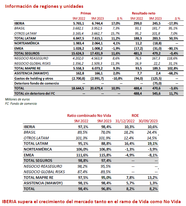 • En México, las primas ascienden a 1.197 millones, con un crecimiento del 42,5%, impulsado por la renovación de un programa de riesgos industriales en el segundo trimestre y la favorable evolución del peso mexicano, que se ha apreciado un 12,7%. El resultado neto alcanzó los 29,7 millones, mejorando un 41,5% frente al de septiembre 2022. El ratio combinado se sitúa en 98,4% y aumenta 2 p.p. principalmente por Salud & Accidentes.