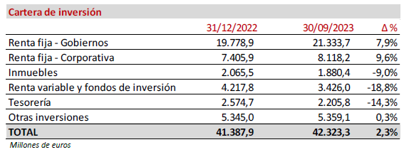 • Respecto a la cartera de inversiones que se detalla a continuación, la estructura por clases de activos no ha tenido cambios significativos en el tercer trimestre. Las plusvalías netas de deterioros han supuesto un impacto en el resultado neto de 22,3 millones a septiembre (70,8 millones en 2022).