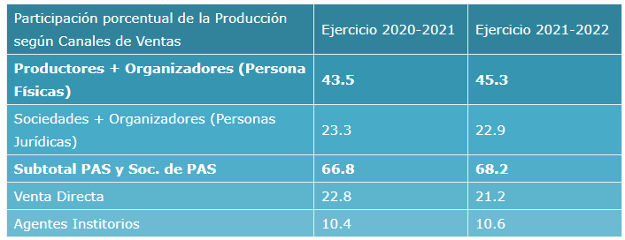 El canal representado por los PAS individuales (las personas físicas) incrementó su participación de 43,5% en el ejercicio 2020-2021 a 45,3% en periodo 2021-2022. De esta manera, los PAS ampliaron su participación 1,8%.
