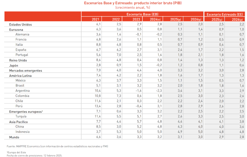 Para América Latina, MAPFRE Economics prevé un aumento del PIB en un 1,6% este año y un 1,7% el que viene, muy pendiente de su relación con Estados Unidos, que puede incrementar la vulnerabilidad de la región en su conjunto. MAPFRE Economics espera un desempeño positivo, pero mixto, con una inflación media para el conjunto de los países del 8,6% en 2025 y 8%, en 2026.