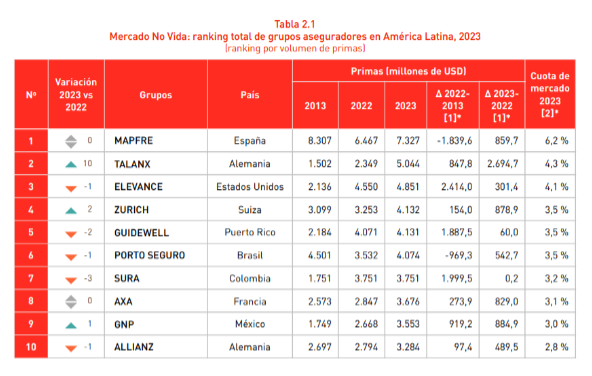 • La aseguradora, con unas primas de 10.559 millones de dólares y una cuota de mercado del 5,2%, es el principal grupo asegurador internacional en Latinoamérica.