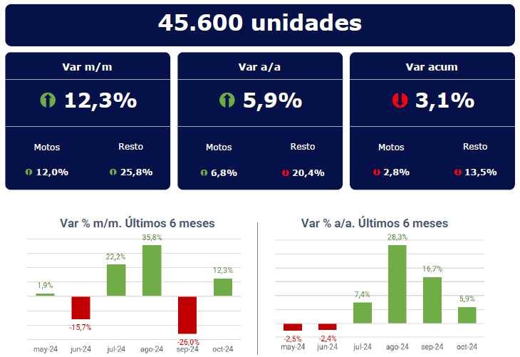 Durante el mes de octubre se patentaron 45.600 motovehículos, 12,3% más que en septiembre y 5,9% más que en octubre 2023. En el acumulado de los diez meses del año, se patentaron 385.122 unidades, 3,1% menos que en el mismo período 2023.