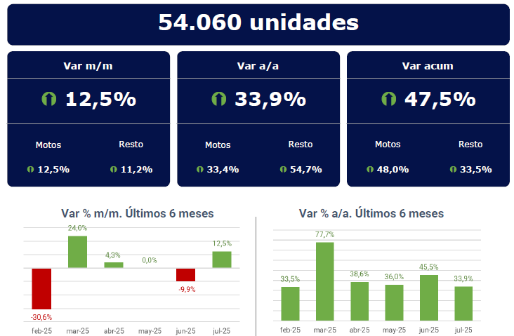 Durante el mes de julio se patentaron 54.060 motovehículos, 12,5% más que en junio y 33,9% más que en julio 2024.