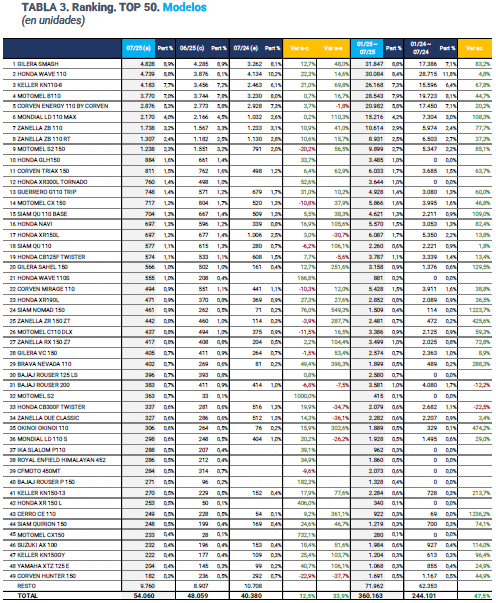 En lo que hace a los modelos más vendidos, en el mes de julio la GILERA SMASH con 4.828 unidades sigue siendo la más vendida. En segundo lugar quedó la HONDA WAVE 110 con 4.739 unidades patentadas, en tercer lugar la KELLER KN 110-8 con 4.183 unidades. Del cuarto puesto al décimo las ventas se distribuyeron así: MOTOMEL B110 (3.770), CORVEN ENERGY 110 BY CORVEN (2.876), MONDIAL LD 110 MAX (2.170), ZANELLA ZB 110 (1.738), ZANELLA ZB 110 RT (1.307), MOTOMEL S2 150 (1.238) y HONDA GLH150 (884).