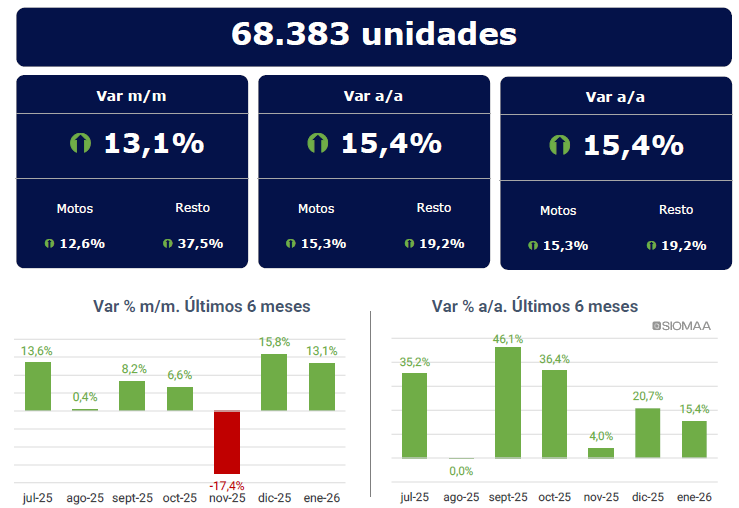 En el mes de enero se patentaron 68.383 motovehículos, 13,1% más que en diciembre y 15,4% más que en enero 2025. Esta cifra representa el enero de mayor patentamiento desde 2018.
