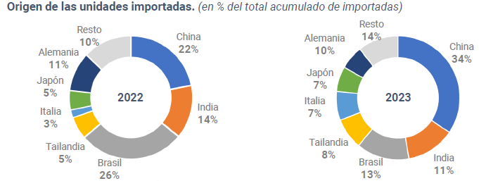 En lo que respecta al origen, los primeros 11 meses de 2023 marcan un constante crecimiento de la fabricación local ya que el 99,1 % de las motos son de origen nacional y solo un 0,9 % importadas. La mayor cantidad de importaciones provienen de China con un 34 %, Brasil 13 % e India con el 11 %. Si comparamos esas cifras contra 2022 vemos que hay una fuerte desaceleración de importaciones desde Brasil, que tenía un 26 % del mercado y hoy sólo el 13 % y también son menos las proveniente de la India, 14 % contra el 11 % actual. Por el contrario China, que tenía un 22 % pasó en 2023 al 34 % del mercado.