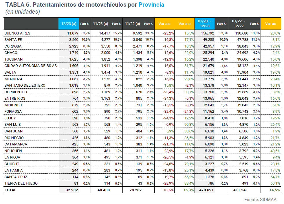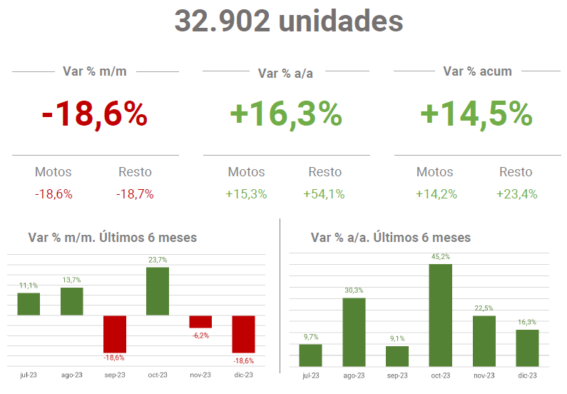 Durante el mes pasado se patentaron 32.902 motovehículos, 18,6% menos que en noviembre y 16,3% más que en diciembre 2022. En el acumulado anual, los patentamientos suman 470.691 unidades, 14,5% más que en 2022.