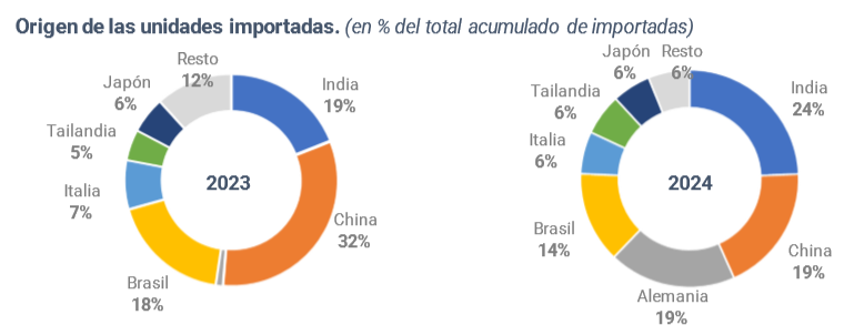 En lo que respecta al origen, los primeros 5 meses de 2024 marcan un constante crecimiento de la fabricación local ya que el 98,6 % de las motos son de origen nacional y solo un 1,4% importadas. La mayor cantidad de importaciones provienen de India con un 24 %, China 19 % y Alemania con el 19 %. Si comparamos esas cifras contra 2023 vemos que hay una fuerte desaceleración de importaciones desde China, que tenía un 32 % del mercado y hoy sólo el 19 % . Crecen las proveniente de la India, 19 % contra el 24 % actual y Alemania con 19 % del mercado actual.