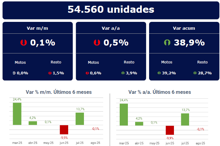 Durante el mes de agosto se patentaron 54.560 motovehículos, 0,1% menos que en julio y 0,5% menos que en agosto 2024.