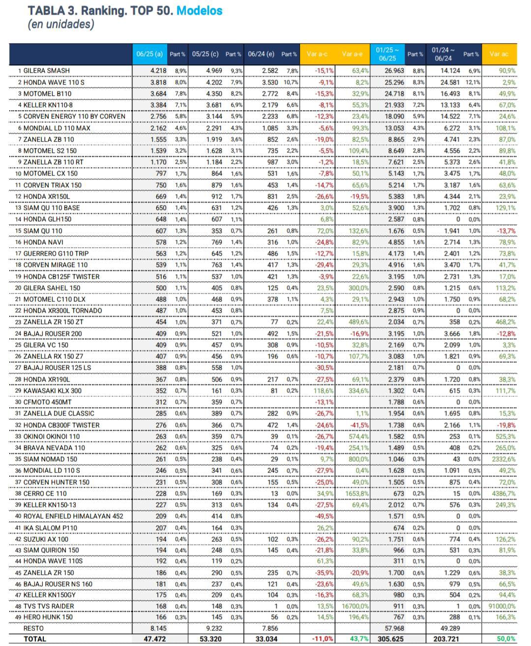 con 3.684 unidades. Del cuarto puesto al décimo las ventas se distribuyeron así: KELLER KN 110-8 (3.384), CORVEN ENERGY 110 BY CORVEN (2.754), MONDIAL LD 110 MAX (2.162), ZANELLA ZB 110 (1.555), MOTOMEL S2 150 (1.539), ZANELLA ZB 110 RT (1.170) y MOTOMEL CX 150