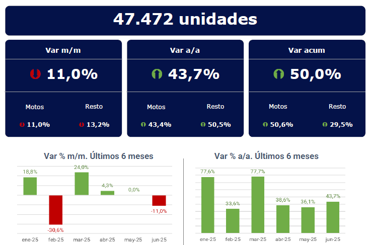 Durante el mes de junio se patentaron 47.472 motovehículos, 11,0% menos que en mayo y 43,7% más que en junio 2024. Así, los primeros seis meses del año acumulan 305.625 motovehículos 0km patentados, lo que equivale a un crecimiento del 50,0% respecto de 2024.