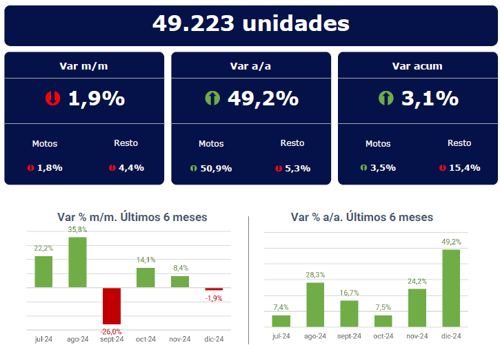 Durante el mes de noviembre se patentaron 49.223 motovehículos, 1,9% menos que en noviembre y 49,2% más que en diciembre 2023. En el acumulado del año se patentaron 485.221 unidades, 3,1% más que en 2023.