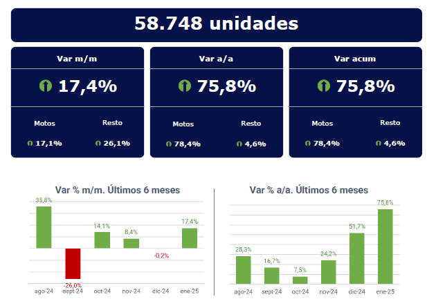 Durante el mes de enero se patentaron 58.748 motovehículos, 17,4% más que en diciembre y 75,8% más que en enero 2024. Esta cifra representa el enero de mayor patentamiento desde 2018.