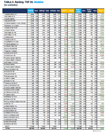 (4.056), CORVEN ENERGY 110 BY CORVEN (3.362), MONDIAL LD 110 MAX (2.753), ZANELLA ZB 110 RT (1.419), HONDA XR150 L (1.364), MOTOMEL S2 150 (1.238), y MOTOMEL CX 150 (1.094).
