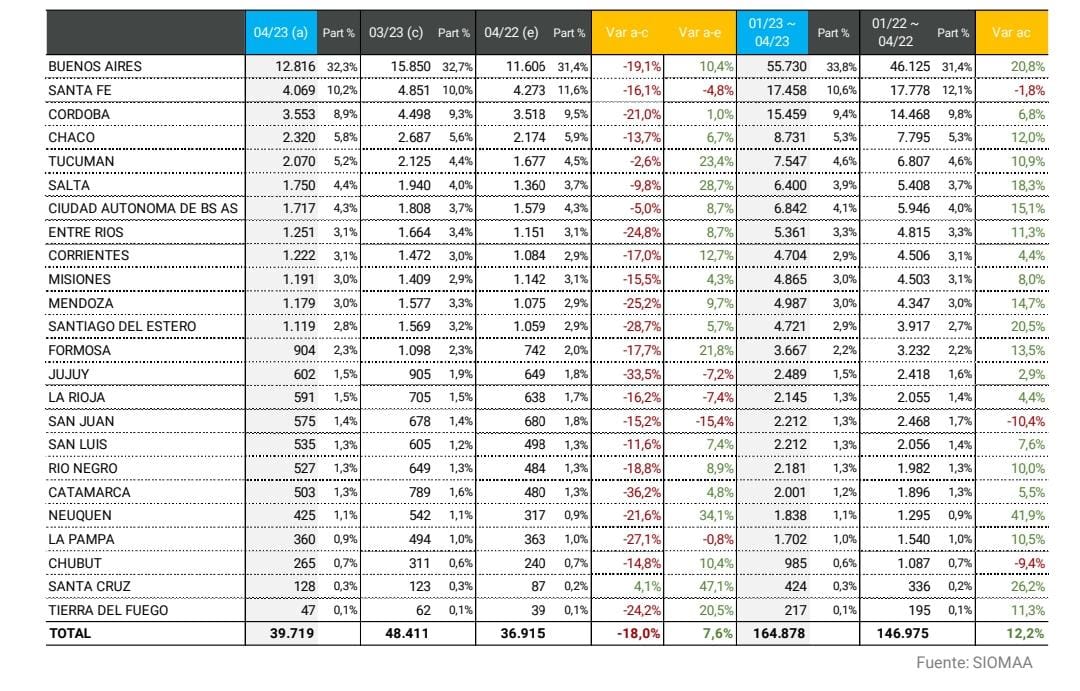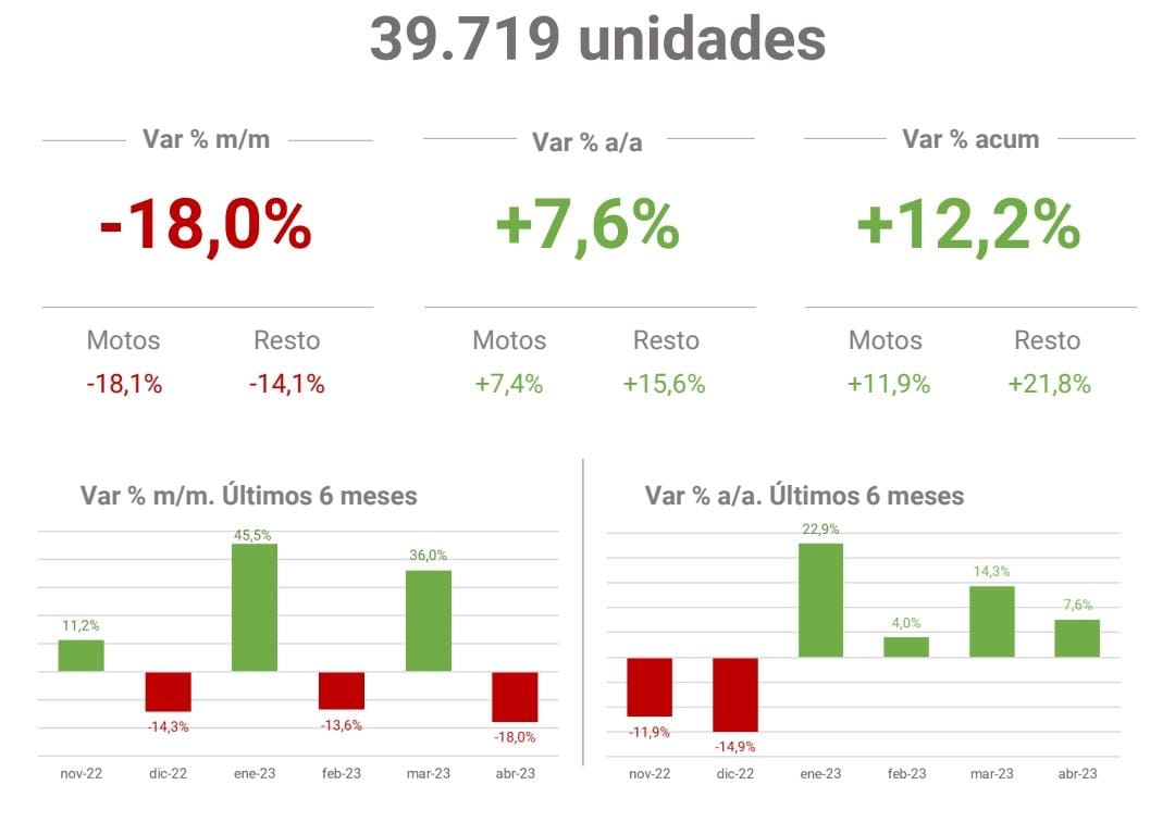 Durante dicho mes se patentaron 39.719 moto vehículos, representando una diferencia de -18,0 % frente al mes de marzo y del +7,6 % frente a abril de 2022.