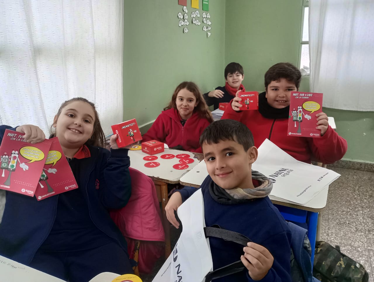 Mediante la articulación con las instituciones educativas, los niños recibieron en sus escuelas el “Kit Nat”, compuesto por una mochila que contiene la revista “Nat, Ivo y vos en la ciudad” en la que aborda la temática vial de manera lúdica junto a un memotest con las señales viales. Los adolescentes recibieron un kit similar que incluye una guía de manejo con el material teórico para rendir el examen de conducir, un folleto sobre conducción segura de bicicletas y calcos réflex, junto a una libreta y lapicera de material reciclado.