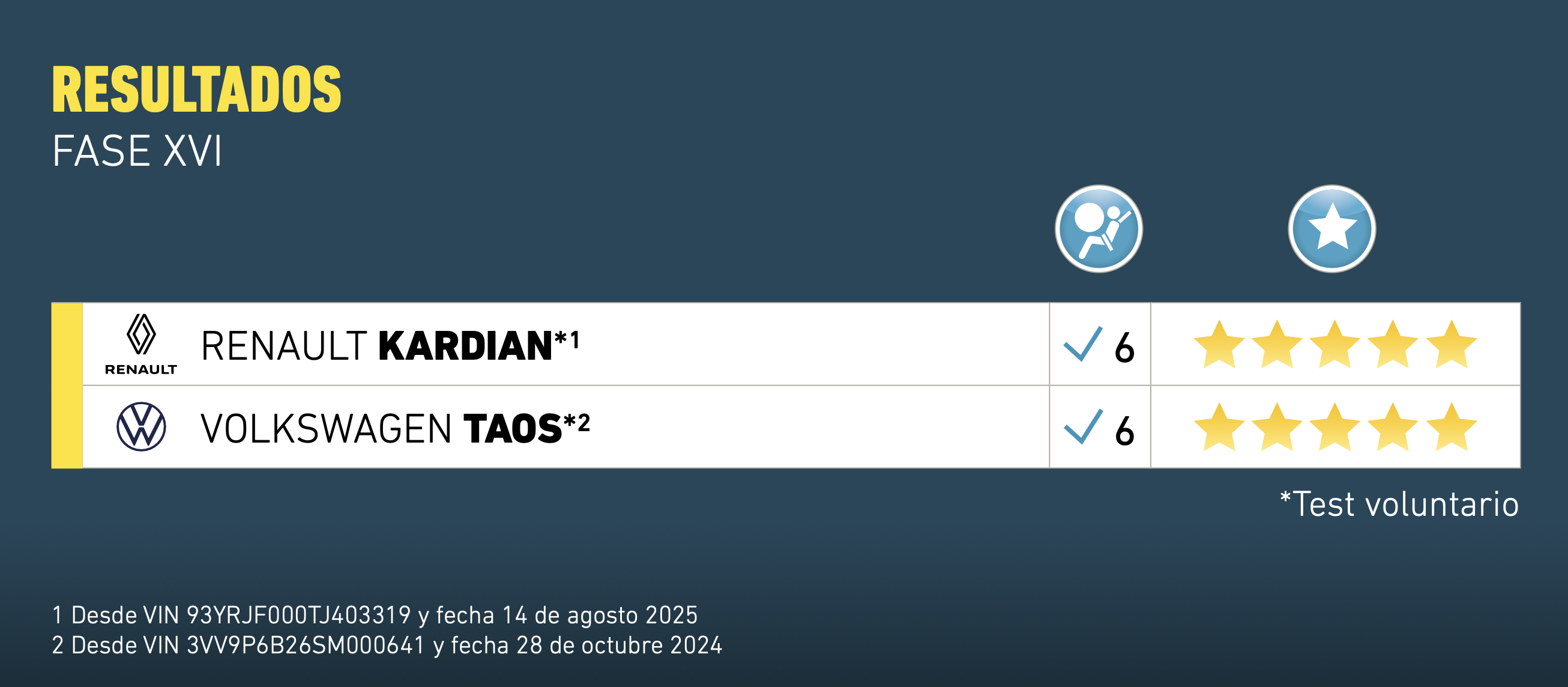 El Programa publica la 7ma ronda de resultados, con las primeras cinco estrellas de Renault con el Kardian y las renovadas estrellas para la actualización del Volkswagen Taos.