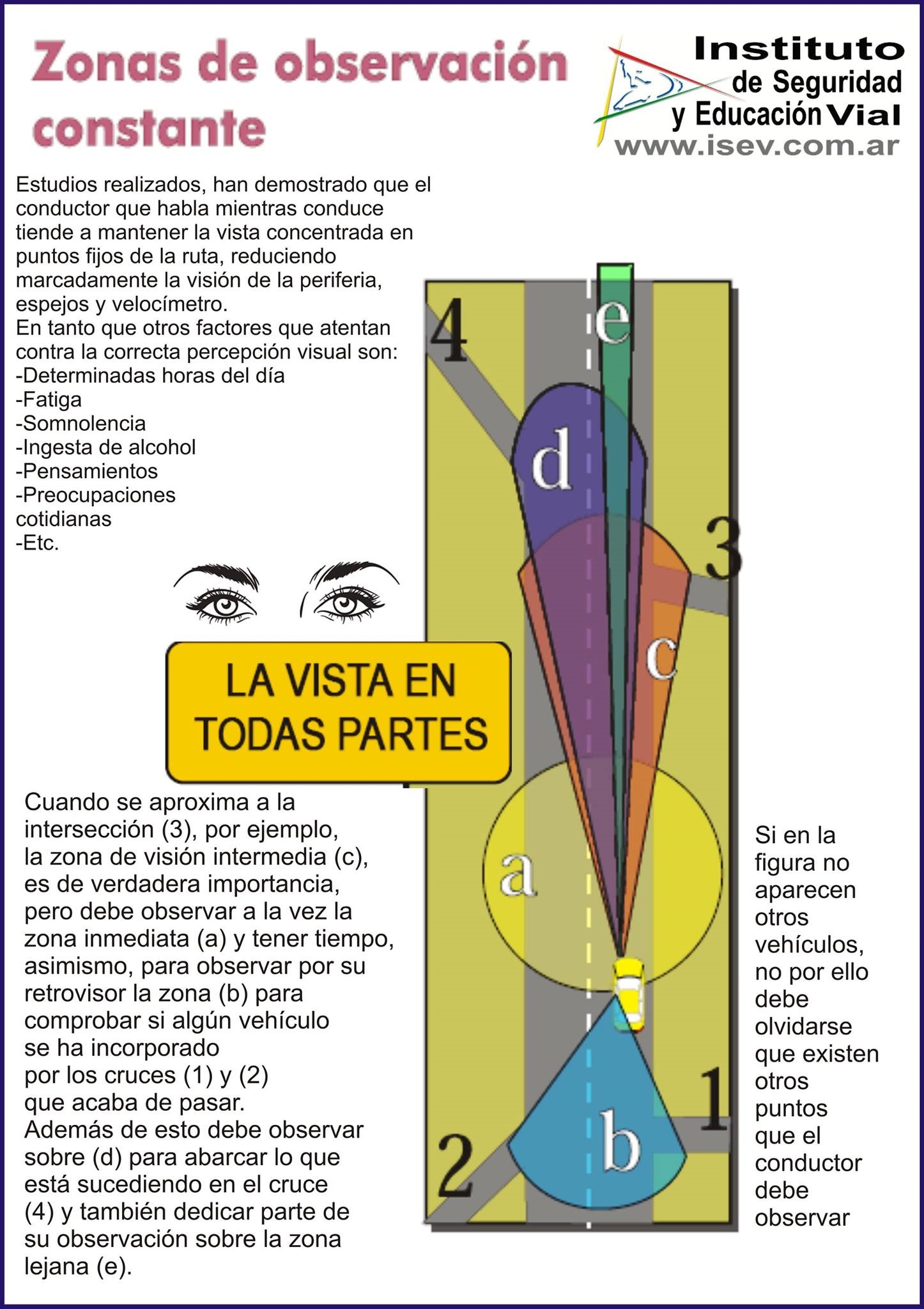 Se debe extender la observación hasta donde sea posible, y tanto hacia adelante como hacia atrás, como a cada uno de los lados. Hay que mantener la vista en movimiento, lo cual además de brindar constante información permite mantenerse alerta, reduciendo la fatiga de la vista.