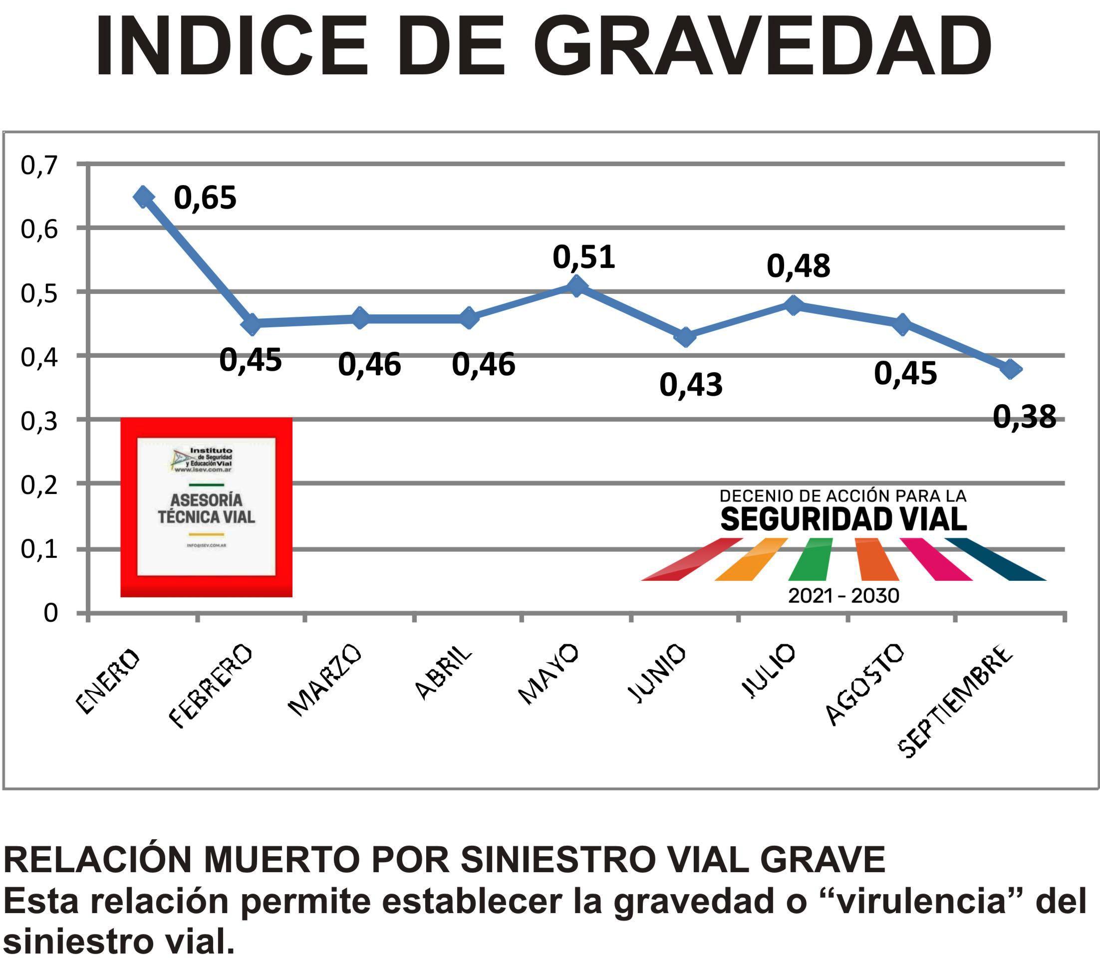 Esta relación permite establecer la gravedad o “virulencia” del siniestro vial. La relación entre SEPTIEMBRE de 2021 y SEPTIEMBRE de 2022 DESCENSO de 0.39 a 0.38 muertes por cada siniestro vial grave.