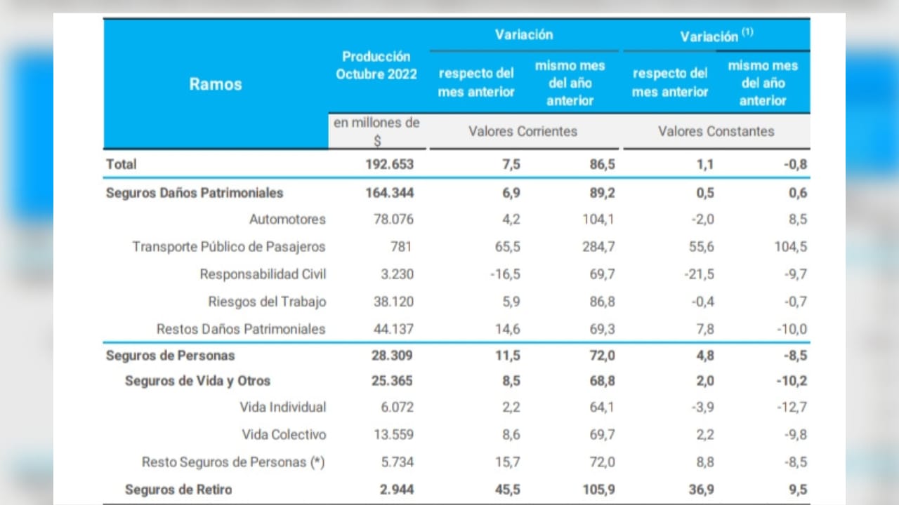 La estimación de la Producción Total de Seguros para el mes de octubre de 2022 fue de 192.653 millones de pesos, de los cuales el 85,3 % corresponde a los Seguros Patrimoniales, el 13,2 % a los Seguros de Vida y el 1,5 % a los Seguros de Retiro.