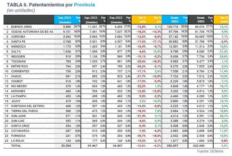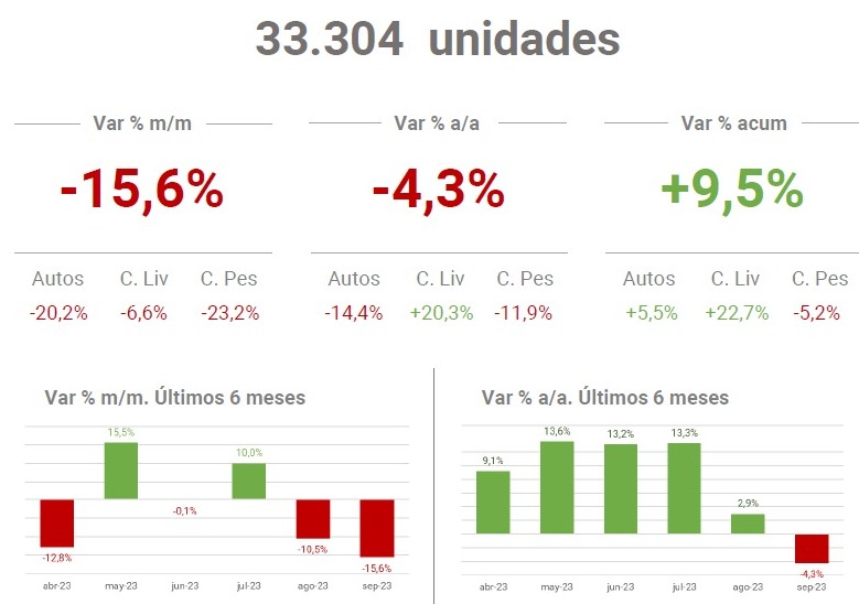 Durante el mes de septiembre se patentaron 33.304 vehículos, 15,6% menos que en agosto y un 4,3% menos que en septiembre de 2022. Al cierre de los primeros nueve meses, los patentamientos suman 352.697 unidades, 9,5 % más que en el mismo período del año pasado.