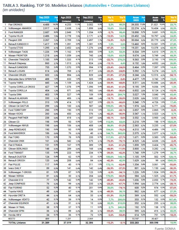 En septiembre todo se mantuvo igual en el primer puesto. El FIAT CRONOS, con 4.488 unidades vendidas sigue ocupando el primer puesto en ventas. Accede al segundo lugar la VOLKSWAGEN AMAROK, 2.917unidades vendidas y completa el podio la FORD RANGER con 2.687 vehículos, la TOYOTA HILUX quedó relegada al cuarto puesto (2.486) y queda en el quinto lugar el PEUGEOT 208 con 2.267 vehículos patentados.
