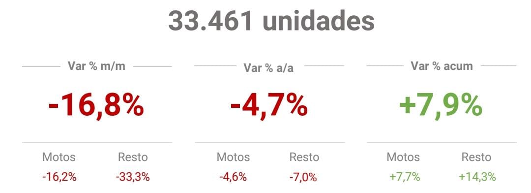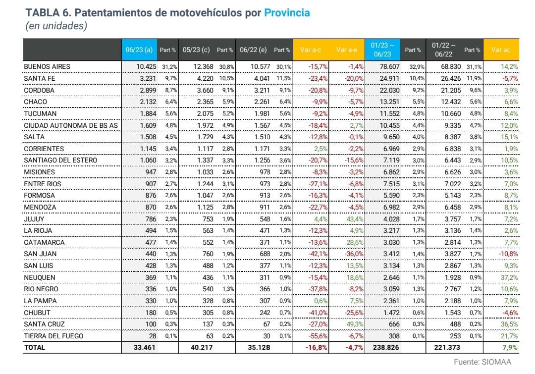 Los patentamientos en junio alcanzaron la cifra de 33.461 unidades, lo que representa un 16,8 % menor a mayo y un 4,7 % menor a junio 2022. En el acumulado anual, los primeros seis meses suman 238.826 unidades un 7,9 % más que en los primeros meses del año pasado