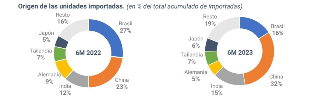 En lo que respecta al origen, los primeros 6 meses de 2023 indican que el 98,7 % de las motos son de origen nacional y solo un 1,3 % importadas. La mayor cantidad de importaciones provienen de China con un 32 %, Brasil 16 % e India con el 15 %. Si comparamos esas cifras contra 2022 vemos que hay una fuerte desaceleración de importaciones desde Brasil y también son menos las proveniente de la India. Por el contrario China, que tenia un 22 % paso en 2023 al 32 % del mercado.