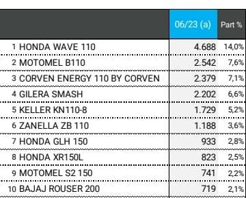 La marca mas vendida en junio fue HONDA, con 8.756 unidades y una participación de mercado del 26,2 %. Le siguieron MOTOMEL, con 4.196 y 12,5 % y CORVEN, con 3.767 y 11,3 % de participación.