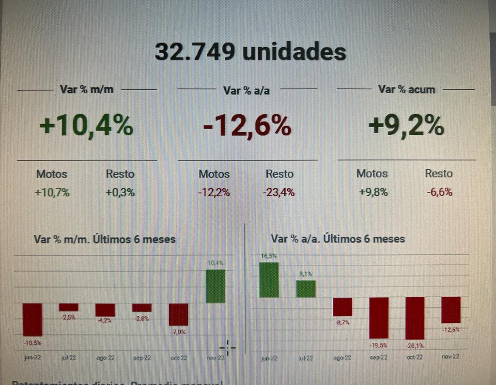 Se patentaron 32.749 unidades. La variación interanual sigue siendo negativa en 12,6 %. Sin embargo, en el acumulado de los primeros once meses, las 382.720 unidades de 2022 son un 9,2 % mas que las del año pasado.