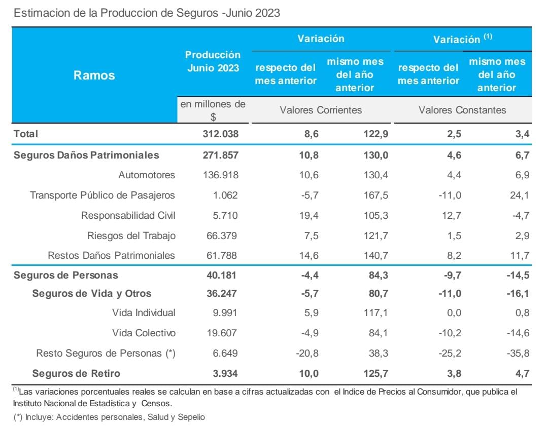 La Producción Total de Seguros para el mes de junio fue de 2023 fue de 312.038 millones de pesos, de los cuales el 87 % corresponde a los Seguros Patrimoniales, el 12 % a los Seguros de Vida y el 1 % a los Seguros de Retiro. Dicha cifra indica a valores corrientes, un incremento del 122,9 % con respecto al mes de junio de 2022 y superior en 8,6 % en relación a mayo 2023.