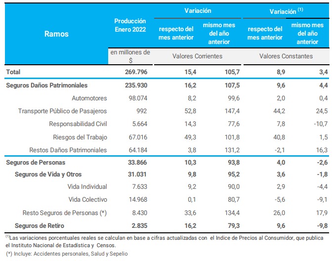 La estimación de la Producción Total de Seguros para el mes de enero de 2023 fue de 269.796 Millones de pesos, de los cuales el 87,4% corresponde a los Seguros Patrimoniales, el 11,5% a los Seguros de Vida y Otros (Vida Individual/Colectivo y resto Seguros de Personas), y el 1,1% a los Seguros de Retiro.