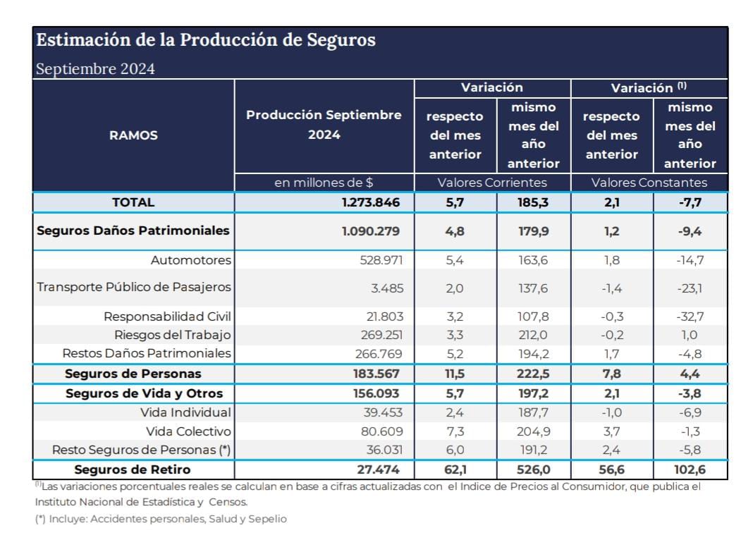 La estimación de la Producción Total de Seguros para el mes de septiembre de 2024 fue de 1.273.846 millones de pesos, de los cuales el 85,6 % corresponde a los Seguros Patrimoniales, el 12,2 % a los Seguros de Vida y el 2,2 % a los Seguros de Retiro. Dicha cifra indica a valores corrientes, un incremento del 5,7 % con respecto al mes de agosto, y es un 185,3 % superior contra el mismo mes del año anterior.
