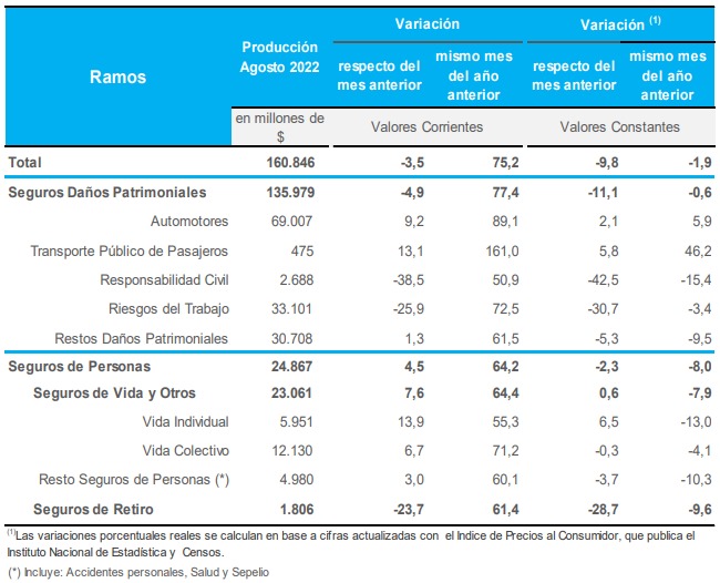 La estimación de la Producción Total de Seguros para el mes de agosto de 2022 fue de 160.846 millones de pesos, de los cuales el 84,6 % corresponde a los Seguros Patrimoniales, el 14,3 % a los Seguros de Vida y el 1,2 % a los Seguros de Retiro. Dicha cifra indica a valores corrientes, una disminución del 3,5 % con respecto al mes de julio, y es un 75,2 % superior contra el mismo mes del año anterior.